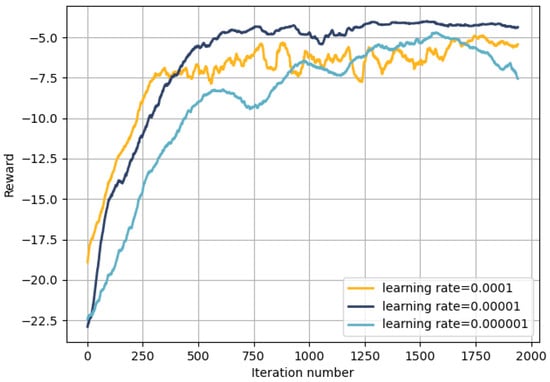 Additionally, the learning rate is a crucial hyperparameter. Figure 5 shows the impact of different learning rates on training outcomes. It can be observed from the figure that the convergence of the improved DDPG algorithm is highly sensitive to the learning rate. When the learning rate is too low, the training process converges to a local optimum. This is also the reason for the reward curve’s pattern of the initial increase followed by a decline, ultimately making it challenging to achieve satisfactory training outcomes. Conversely, when the learning rate is too high, the parameters fluctuate too violently during training, making it difficult to converge to a desirable solution and resulting in significant volatility. However, it is evident that setting the learning rate to 0.00001 leads to stable convergence and superior performance. Therefore, in subsequent simulations, we will set the learning rate to 0.00001.
