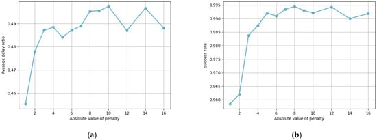 Simulation results of penalty. (a) Average delay ratio against absolute value of penalty; (b) success rate against absolute value of penalty.