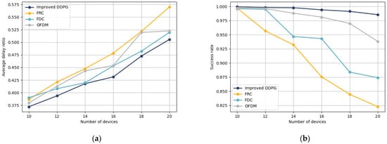 Simulation results of different schemes. (a) Average delay ratio against the number of devices; (b) the success rate against the number of devices.