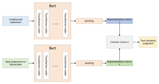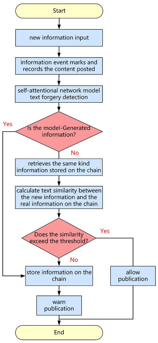 After determining that a text is artificial, the system cannot determine whether the text is false information solely based on language logic. Therefore, to address the need for information traceability and to find the source of similar false information, many actual news texts released by credible, authoritative platforms obtained by crawlers are uploaded and stored. Then, using the statement similarity model, the manufactured text is matched against the currently detected text and the text on the chain. If the similarity exceeds the set threshold, it is determined that the descriptions of the two texts are the same, and the results of the text detection on the chain are returned. If no corresponding similar text is found, the current text content is considered false information. Otherwise, the text content is considered valid.