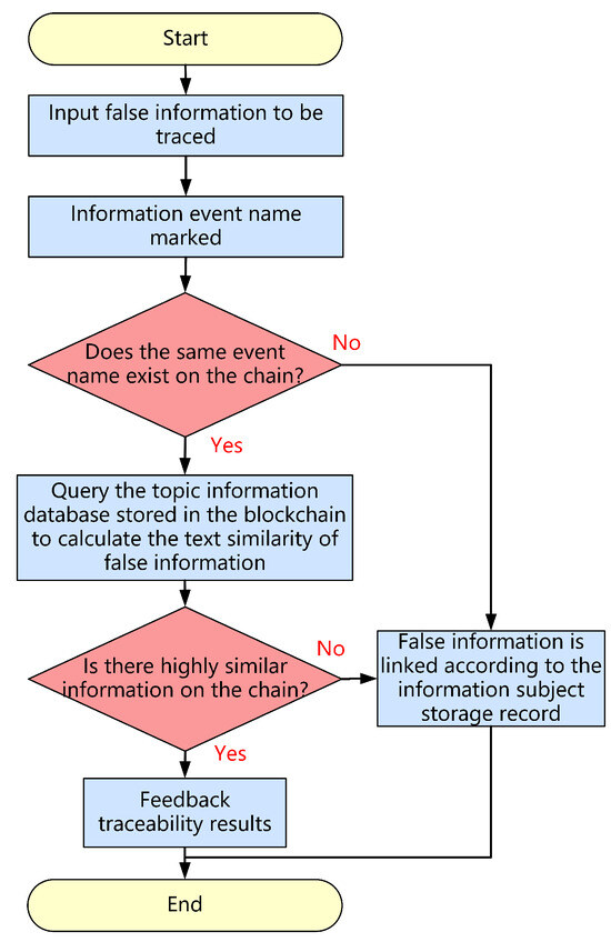 The false information traceability function mainly contains information event name marking, information similarity calculation, and blockchain traceability. The function process is shown in Figure 3. Firstly, the system uploads the false information content to the system for information event name marking. Secondly, the system queries whether false information with the same event name is already stored. If there is no storage on the chain, the uploaded information is registered and stored on the chain; otherwise, the text similarity detection algorithm is used to compare the similarity of the false information. If the information’s similarity exceeds the threshold, the system retrieves the stored data on the chain to enable false information traceability and evidence extraction; otherwise, the false information is stored on the chain.