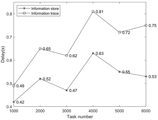In Figure 6 and Figure 7, we can see that for the same task volume, information traceability requires more delay and throughput compared to information storage. This is due to the need to retrieve the index query of the information during information traceability, increasing the system overhead. With the continuous growth of the task volume, although task processing latency and throughput show an upward trend, they are still within a reasonable range, indicating the feasibility and stability of the system proposed in this paper. In addition, information throughput tends to level off from 3000 tasks. This paper suggests that this phenomenon occurs because the number of system tasks reaches the overall performance bottleneck of this block simulation network.