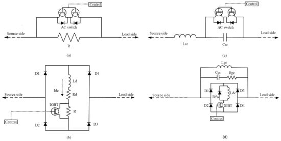 Conventional fault current limiter topologies: (a) The series dynamic braking resistor FCL topology; (b) The bridge-type FCL topology; (c) The series resonance FCL; (d) The parallel resonance FCL topology.