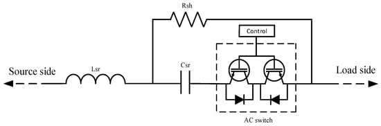 The improved configuration of series LC resonance-based FCL is illustrated in Figure 2. The reactor is connected in series to the capacitor and the AC switch, and the limiting resistor is connected between the reactor and capacitor, in parallel to the capacitor and AC switch. The values of the components were selected to create a series LC resonance at the network frequency as shown in Equation (1). To reduce power losses, the value of the limiting resistor () should have a relatively high resistance.