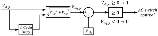 Figure 4 depicts the block diagram of the fault detection method and control scheme of the FCLs. The control unit transforms the three-phase values of the PCC voltage into the dq reference frame. The threshold voltage value is set to 0.9 pu. Following this, is subtracted from , resulting in a positive value during normal system operation and a negative value during a fault. This signal serves as the gate control signal for the IGBT-based AC switch within the control unit. Employing the dq0 transformation results in better tracking and stable fault detection than the direct monitoring of the three-phase voltage [35,36].
