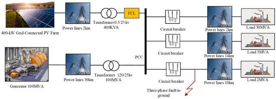 The simulated power system has a 400 kW PV farm with a 100 MW synchronous generator connected to the PCC (see Figure 5). The power system’s load is divided at the PCC into three parallel branches, each linked to the PCC via power lines. The load distribution includes a 30 MVA load located 2 km away, a 3 MVA load 14 km away, and a 2 MVA load 10 km away from the PCC. A pair of transformers are used to transform the voltage of the power sources, a step-up at a voltage of 0.5/25 kV for the PV farm and a step-down of 120/25 kV for the synchronous generator. The tested FCLs are positioned between the step-up transformer and the PCC. A simulated fault is introduced in one of the load branches, resembling a power line failure. The faulty branch is protected by a three-phase circuit breaker with a response time of 60 ms.