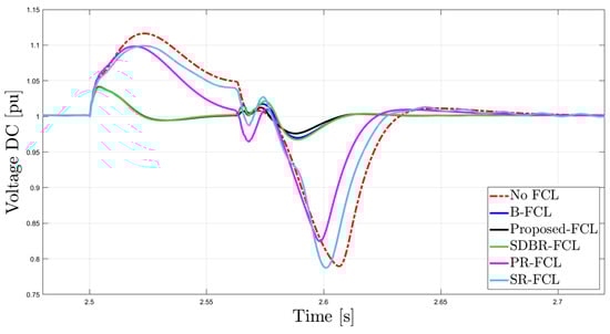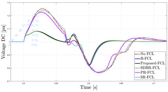 The simulation results of DC-link voltages for all studied cases are presented in Figure 6. Throughout the fault period, there is a rise in the DC-link voltage. The proposed FCL, SDBR-FCL, and B-FCLs had the most effective limitation of the voltage rise, suppressing it to 1.04 pu and quickly stabilizing at the pre-fault level. The PR-FCL limited the voltage spike to 1.09 pu, while the SR-FCL was slightly worse, restricting the spike to 1.10 pu. Both SR- and PR-FCLs struggled to maintain the voltage at the pre-fault level. Furthermore, the proposed FCL, SDBR-, and B-FCLs operated with the best transient stability index of 0.07. The PR-FCL performed significantly worse with a transient stability index of 0.35. The worst result of 0.41 was obtained with SR-FCL (see Table 2). For reference, the non-protected system had the highest index of 0.48 indicating the lowest stability.