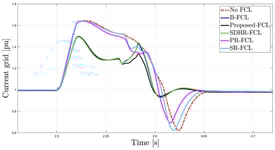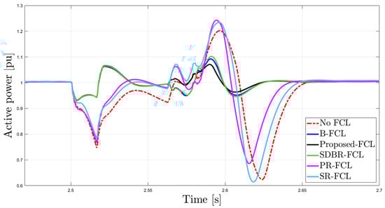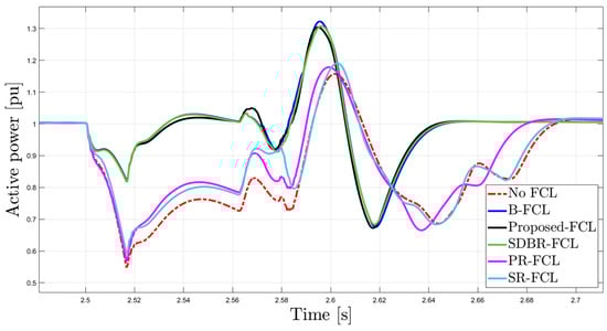 The active power simulations are shown in Figure 13. During the fault period, the proposed FCL, B-FCL, and SDBR-FCL effectively limit the drop in active power to 0.82 pu. Considering the stability indexes, the proposed FCL outperforms the other FCLs, providing a slight advantage with an index of 0.29 compared to the identical stability index of 0.31 for the other two cases. The PR-FCL performed significantly worse, allowing a larger drop in power to 0.57 pu, leading to an increased transient stability index of 1.38. The SR-FCL provided the least effective performance due to a large power drop to 0.59 pu, resulting in the worst stability index of 1.39. At the same time, the system without an FCL experienced a power drop to 0.55 pu and a stability index of 1.61.