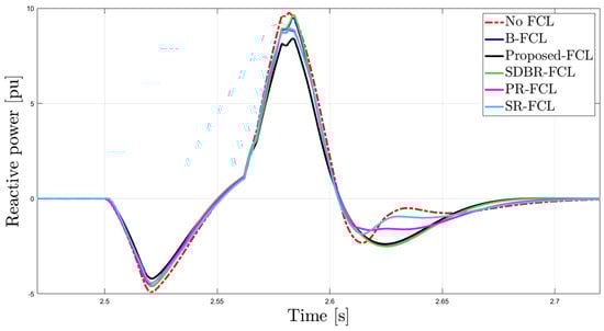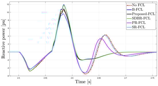 Reactive power simulation results are detailed in Figure 9. During the fault period, the proposed FCL limited the sag in reactive power to −4.2 pu, achieving the best stability index of 10.95 among the tested FCLs. The PR-FCL and SR-FCL showed slightly inferior performance, limiting the drop to −4.5 pu with a stability index of 11.78 and 11.81, respectively. The worst outcomes were observed with the SDBR- and B-FCLs, which allowed a deeper drop in reactive power to −4.6 pu contributing to the worst stability indexes of 11.86 and 11.87. The system without an FCL experienced the deepest drop to −4.9 pu with a stability index of 13.07.