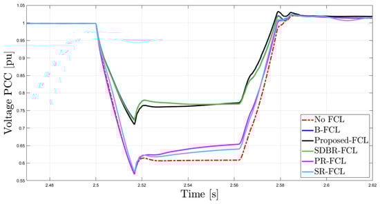 PCC voltage for different FCLs, first fault scenario (fault resistance is 7.5 Ω).