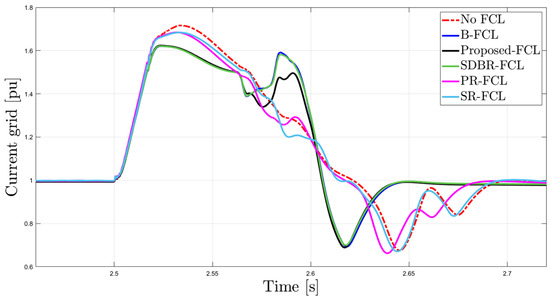 The fault currents for all cases are shown in Figure 7. During the fault period, the proposed FCL restricts the fault current spike to 1.5 pu, stabilizing at 1.28 pu, performing similarly to SDBR-FCL and B-FCL, which is the most effective performance among the compared FCLs. In contrast, PR- and SR-FCLs performed significantly worse, struggling to limit the initial fault current spike, peaking at 1.64 pu and 1.63 pu, only slightly lower than the system without FCL, which peaked at 1.64 pu. The examination of stability indexes draws a similar picture, as the SDBR-FCL and the B-FCL excelled with a stability index of 1.86, while the proposed FCL showed an insignificant difference and achieved an index of 1.87. The PR-FCL and SR-FCL were the least effective with stability indexes of 2.91 and 2.93, respectively, while the stability index of the system without FCL was 2.99.