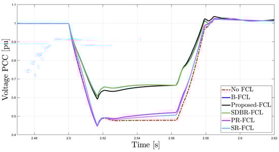 The behavior of PCC voltage during fault and recovery periods is depicted in Figure 10. The SDBR-FCL and B-FCL exhibit the most effective performance, limiting the voltage dip to 0.72 pu and stabilizing at 0.77 pu, with transient stability indexes of 1.29 for the SDBR-FCL and 1.28 for the B-FCL. The system equipped with the proposed FCL had a slightly less effective performance; the voltage sag is limited to 0.71 pu and recovers gradually to 0.77 pu, resulting in a stability index of 1.33. For systems with PR-FCL and SR-FCL, the voltage sag worsens to 0.57 pu, the poorest result among the cases compared; however, they gradually recover to 0.65 pu and 0.64 pu for PR-FCL and SR-FCL, respectively, with stability indexes of 1.93 and 2.00.