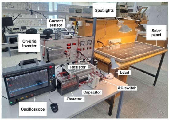 We could not access a real PV power plant and electric grid for experimental validation. Therefore, to validate the proposed FCL’s operation, the studied power system was implemented at a reduced voltage and current scale in the laboratory. Figure 16 shows the experimental setup, with a single 135 W solar panel with a pair of high-power spotlights as light sources, coupled with a 300 W on-grid inverter to synchronize the output voltage to 220 V at a frequency of 50 Hz. The tested system was loaded with a 40 W incandescent light bulb. The proposed FCL was constructed on the table via separate components such as a reactor, capacitor, resistor, and semiconductor-based switch, connected by external wiring. The switch was implemented using a pair of silicon carbide-based power MOSFETs, characterized by ultrafast response times, allowing the rapid insertion of the fault-limiting impedance into the fault circuit. A circuit breaker was integrated at the output of the inverter to prevent damage to the system in case of high fault currents.