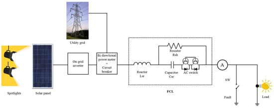 The circuit diagram of the experimental setup is displayed in Figure 17. The solar panel is placed on a separate stand in a horizontal position with two spotlights installed above it, used as light sources for energy conversion. The solar panel is connected directly to the on-grid inverter, which converts the direct current from the solar panel to alternating current and synchronizes with the utility grid. The clamp-type current sensor for monitoring the phase current is connected between the FCL and the faulty branch. Fully detailed parameters of the tested setup are presented in Table 4.