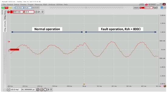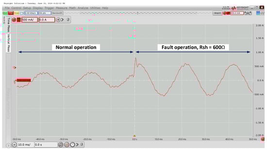 Figure 18 shows the line current during normal and fault operation modes with the proposed FCL. In this case, the resistance of Rsh was set to 600 Ω. During normal operation, the nominal phase current is 250 mA (peak-to-peak). When the fault was initiated, the control unit kept the IGBT switch in the OFF position, limiting the initial peak of the fault current to 800 mA (peak-to-peak), which rapidly stabilized at 600 mA. The application of the proposed FCL prevented the circuit breaker from tripping the disconnection of the source during the fault.