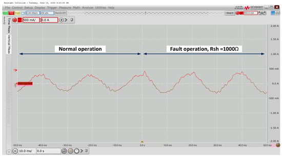 Figure 20 depicts the phase current for the case where the resistor Rsh was set to 1000 Ω. When the fault was initiated, the phase current value slightly increased from the nominal 250 mA (peak-to-peak) to 375 mA (peak-to-peak). The rise in fault current was quickly restricted by the proposed FCL, preventing the operation of the circuit breaker. Compared to the previous cases, the increased resistance of Rsh resulted in an improved transition nearly from normal operation to fault operation and limited the fault current to near nominal value.