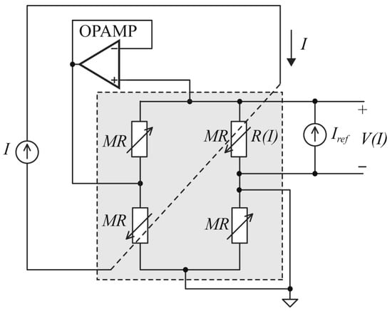 Ro being the MR resistance of the element at zero current and SR its resistance sensitivity. As Figure 1 shows, the operational amplifier (OPAMP) prevents any current from flowing through the bridge resistances adjacent to R(I), ensuring that all the bias current Iref flows through the element R(I) under test. In these conditions, the voltage drop across R(I) will be given by