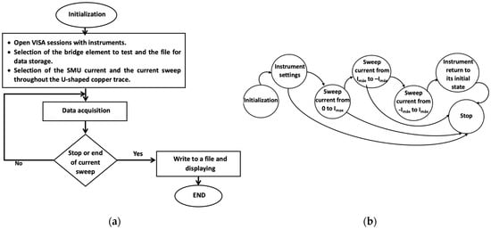 A LabView-based routine was designed to control the electronic equipment and to carry out the acquisition process of measurements. Figure 5 shows the flow diagram and the logic states considered to implement the virtual instrument. To achieve this, the user must enter the current interval (I) that will flow through the copper conductor; the current level that will bias the element under test (Iref, provided by the SMU) and the file where all the measurements will be saved. At the end of the current sweep, the software routine will show graphically the voltage drop V(I) against electrical current I.