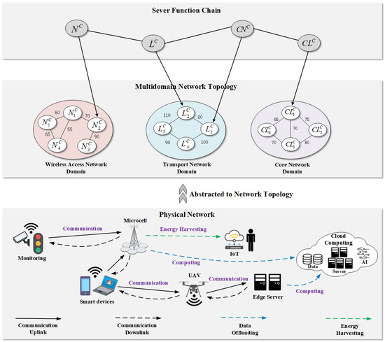 In the edge computing network model, the integration of multidomain physical networks with service function chain (SFC) embedding algorithms offers a highly specialized and precise resource management strategy. Edge computing networks reduce data transmission latency significantly by deploying computational resources closer to end-users and IoT devices, thereby enhancing service response and data processing efficiency. Moreover, the design of multidomain physical networks allows dynamic distribution of network resources across various geographic and logical domains, facilitating flexible scheduling of edge computing resources. The service function chain embedding algorithm, building on this, virtualizes physical resources distributed across multiple domains, effectively supporting diverse network services. This holistic application not only improves resource utilization but also enhances the scalability and security of the network, especially in managing complex data and service demands in smart cities. SFC request refers to a type of request issued within a computer network with the aim of executing a specific service function chain. When users or applications require completing specific tasks or obtaining particular services, they send such requests. SFC requests traverse along the network path and pass through a series of network nodes en route. Each node performs specific service functions, which are organized in a certain sequence to form the service function chain, ultimately meeting the requester’s needs. Consistent with prior work [1], we abstract the underlying physical network as an undirected graph, denoted as , where represents the set of underlying nodes, represents the set of underlying links, A and A respectively represent the attributes associated with the underlying nodes and links. Similarly, we use another undirected graph to represent the service function chain embedding, denoted as , where represents the set of nodes within the service function chain, represents the set of links within the service function chain, and , respectively, represent the attributes associated with the nodes and links within the service function chain. Each time a request is issued, the underlying network resources need to be greater than the network resources required by the request, i.e., where and . Figure 1 illustrates an edge computing network model based on virtual architecture. The virtual network request comprises multiple layers, with each distinct layer describing various network functionalities and services. Moreover, these layers are utilized to specify the necessary resources and services required to fulfill specific demands.