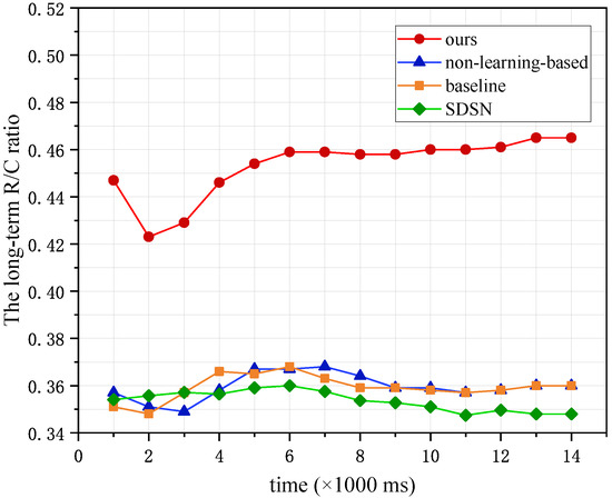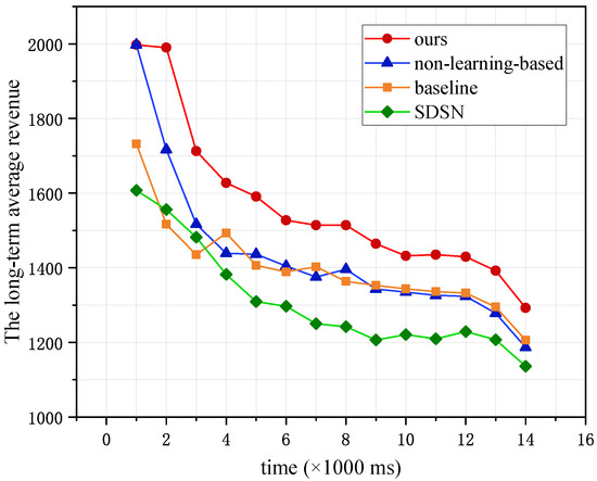 In the final experiment, we compare the long-term average revenue–cost ratios defined in Equation (3) across the four algorithms. Figure 4 illustrates the fluctuations and disparities in the long-term average revenue–cost ratio among these algorithms. The algorithm we proposed demonstrates metric values that are 2.7%, 2.7%, and 3.4% higher than those of the non-learning-based, baseline, and SDSN ones, respectively. Initially, when network resources are abundant, all four algorithms yield higher revenue–cost ratios. However, as the number of SFCRs increases, node and link loads escalate, leading to heightened network resource consumption and an inability to accommodate new SFCRs.
