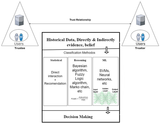 The Bayesian approach facilitates indirect trust calculation based on the uncertainty of direct trust, effectively excluding malicious feedback and providing a robust foundation for trust evaluation in 6G networks [80,81]. By incorporating probabilistic reasoning, Bayesian methods offer a systematic and principled framework for trust assessment, contributing to the overall reliability and security of 6G communication systems.