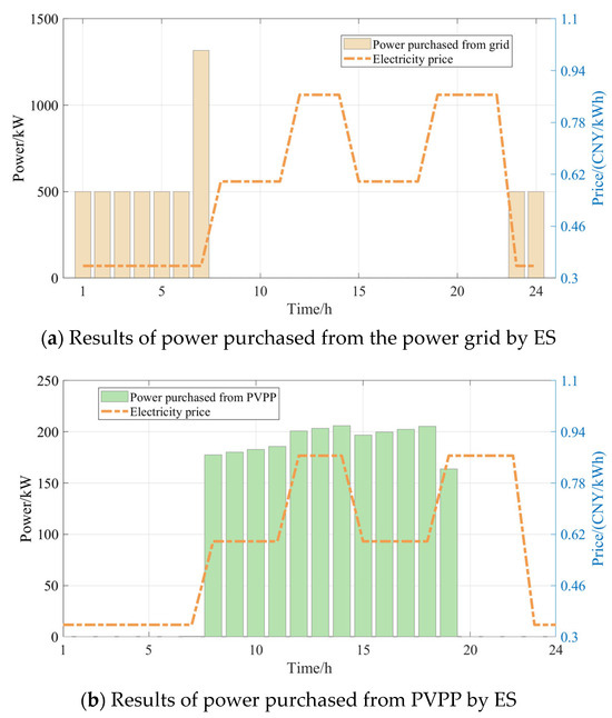 Figure 3 and Figure 4 show the results of the ES’s power purchased from WP, PVPP, and the grid and the results of the ES’s operation in the power dispatch meta-universe platform, respectively. As can be seen from Figure 3, in order to reduce the cost of purchasing electricity, ES chooses to purchase 2303.67 kW from PVPP and 4421.30 kW from WP instead of the grid during the period of higher electricity price (8:00–22:00). While during the period of the lower electricity price (1:00–7:00) and (23:00–24:00), ES will choose to purchase 5317.25 kW of electricity from the grid instead of purchasing electricity from WP and PVPP. This allows the ES equipment to meet its own power demand, and the excess power is stored for later use during peak grid electricity prices, thus saving costs. The results show that ES purchases electricity from the grid during the grid electricity price valley periods, simultaneously meeting its own electricity demand and charging the ES device. The excess electricity is stored for later use during the grid electricity price peak periods, leading to cost savings. During periods of high grid electricity prices (8:00–22:00), ES chooses to purchase electricity from WP and PVPP. This can not only facilitate the consumption of renewable energy, but it also exhibits a notable peak-shaving effect. Additionally, ES further reduces the electricity cost paid the power grid by 4556.99 CNY. Additionally, the grid can yield an additional profit of 120.26 CNY by charging the network fees.