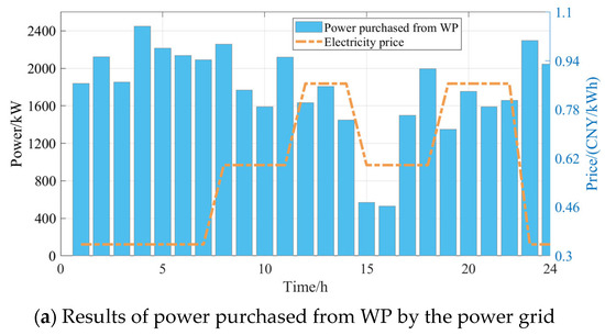 Figure 5 shows the sale of electricity from WP and PVPP to the power grid. On the one hand, WP and PVPP can sell the affluent power to the grid to promote the consumption of new energy and increase the profits of WP and PVPP; on the other hand, the grid can reduce the pressure of power generation by purchasing power from WP and PVPP on the premise of meeting the demand for electricity. Of this, WP sells 42,426.10 kW to the grid and PVPP sells 12,848.93 kW to the grid.