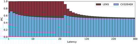 One final experiment is set up to highlight the limitations of the current LEN5 commit stage when dealing with very-long-latency coprocessors, such as those implementing Post-Quantum Cryptography (PQC) cryptographic functions. In these cases, the coprocessor latency exceeds the ROB size. As previously noted, due to the in-order allocation of the ROB, it is not possible to issue more instructions than those that can fit inside the ROB. The simplest test case is run with the NIB set equal to the coprocessor latency to demonstrate the performance degradation resulting from this limitation. This setup matches the condition where, in all previous tests, LEN5 could reorder instructions and completely hide the coprocessor’s execution latency. The experiment is repeated for a wide range of latency values, with the results reported in Figure 6. As shown, once the latency value approaches the ROB size (32), the IPC of LEN5 starts to degrade, eventually reaching an asymptotic limit of 0.5, similar to the in-order CPU. This degradation occurs because, once the ROB is full, the issue stage must stall until the oldest in-flight instruction, the coprocessor instruction, is retired.