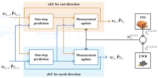 The algorithm for the KF under CMN based on a single direction is presented as Algorithm 3. Figure 1 illustrates the configuration of the KF under CMN based on a single direction. The figure shows that in the proposed method, the state vector is split into two subfilters based on direction. Each subfilter estimates its own one-step prediction and measurement update with the distance difference between the INS and UWB. Additionally, the one-step prediction from one subfilter is used to assist with the measurement update of the other. Finally, the outputs of both subfilters are merged to calculate the final output.