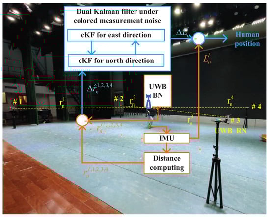Herein, we employ UWB to assist with INS human localization. Figure 2 illustrates the configuration of the dual KF designed for INS-based integrated human localization under CMN based on a single direction. The foot-mounted inertial measurement unit (IMU) measures the human position, and the INS-based distances between the human and the UWB reference nodes (RNs) are computed. Furthermore, the UWB-based distances between the human and UWB RNs are computed. It should be pointed out that the IMUs cannot directly measure position, it uses acceleration and gyroscope data to calculate the velocity in the navigation frame and further calculate the position. Then, the difference of is computed, serving as an input to the dual KF under CMN. The filter produces an error estimate of the INS position . Then, the difference of is computed as the final output.