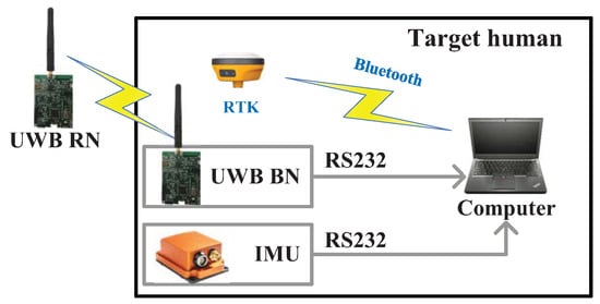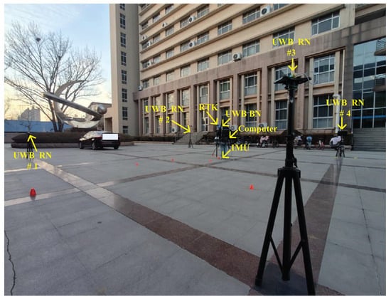 In this study, the real-world test is conducted near the University of Jinan’s No. 1 building, as depicted in Figure 3. The figure shows that we employ four UWB RNs placed around the experimental site. The target pedestrian is equipped with a foot-mounted IMU, real-time kinematic (RTK), UWB blind node (BN), and one computer. In order to obtain the 2D human’s position, the layout of UWB base stations needs to ensure that the target pedestrian can obtain the distance of at least three UWB stations while walking; the parameter of the UWB localization system used in this work is listed in Table 1. In this article, we ensure that the distance information from all the UWB stations can be obtained during pedestrian walking. Here, the foot-mounted IMU measures the , the UWB BN measures the , and the RTK is the reference standard for the experiment; its parameter is listed in Table 2. All sensor data are input to the computer. The test structure is shown in Figure 4. Note that the inertial sensors need to be calibrated before the test, including static and dynamic calibration. Static calibration is performed without any movement by recording the output offset value of the sensor and correcting it to the zero position. Dynamic calibration criteria are used to calibrate sensors during specific actions or movements. By performing actions or movements under known conditions and comparing the sensor output, the offset error of the sensor can be accurately calculated and corrected. In this work, we use the software provided by the sensor to compensate before the experiment begins directly.