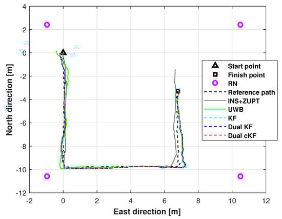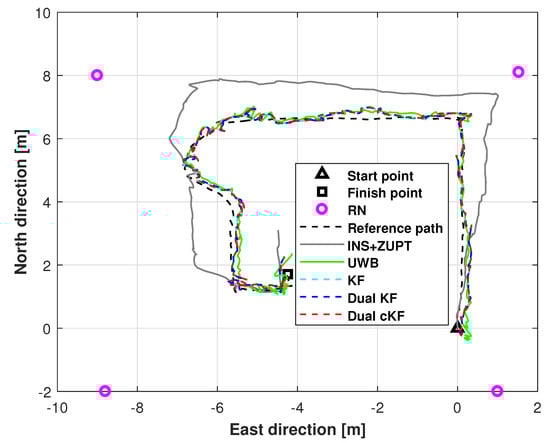 Similar to Test 1, the figures show a noticeable accumulation of errors in the INS’s solution. All the filters’ and the UWB’s solutions can provide positions similar to the reference value. Compared with other methods, the proposed dual cKF method can provide a solution closer to the reference path, demonstrating the effectiveness of this approach.