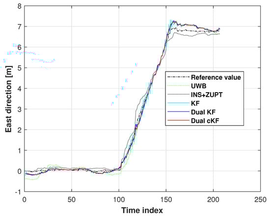 Reference value and the position in the east direction measured by the INS + ZUPT, UWB, KF, dual KF, and dual cKF in Test 2.