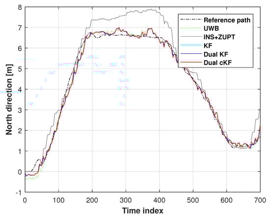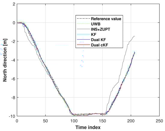 Reference value and the position in the north direction measured by the INS + ZUPT, UWB, KF, dual KF, and dual cKF in Test 2.