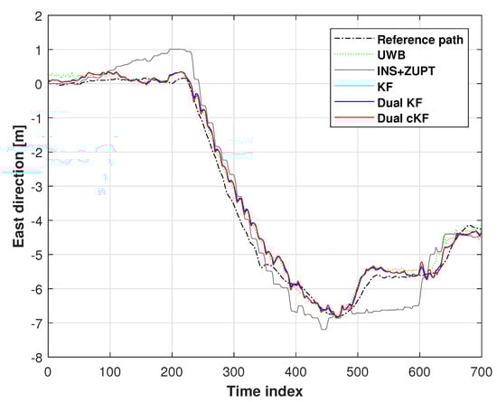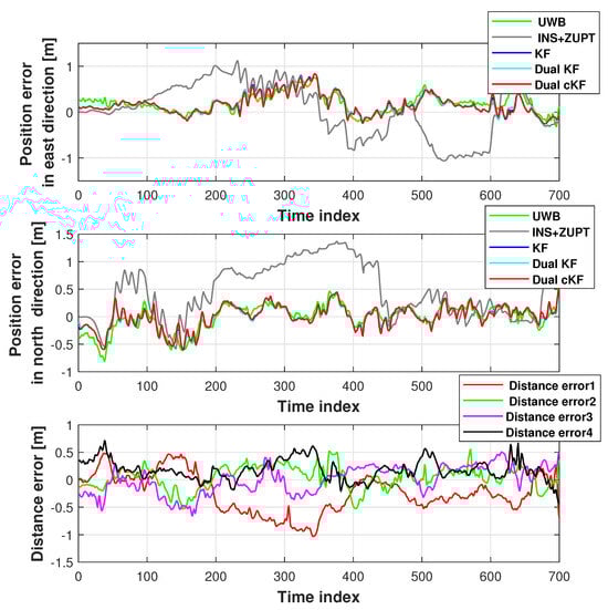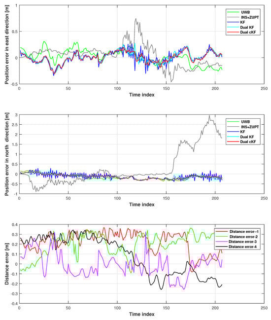 Figure 12 and Figure 13 show the positions of the INS + ZUPT, UWB, KF, dual KF, and dual cKF measured in the east and north directions in Test 2 and the reference values. The figures show different trajectories in Test 2. Figure 14 shows the UWB distance errors and the position errors of the methods in Test 2. From the figure, we can infer that the proposed method has the best performance. The black dashed line indicates the reference path, while the gray solid line shows the INS with the ZUPT method, the green dashed line represents the UWB-only solution, the cyan solid line depicts the position estimated by the KF, the blue solid line illustrates the trajectory from the dual KF method, and the red solid line represents the trajectory from the proposed dual cKF method. From Figure 12, we can see that the INS’s east position has some big errors from the time index of 100 to 250 and from the time index of 500 to 600. Moreover, all the filters’ solutions can provide positions similar to the reference value, which is better than the UWB’s solution. Compared to the other methods, the proposed dual cKF method demonstrates its effectiveness by providing a solution that closely matches the reference path. From Figure 13, we can see that all the filters’ solutions can provide positions similar to the reference value, which is better than the UWB’s solution. Compared to the other methods, the proposed dual cKF method demonstrates its effectiveness by providing a solution that closely matches the reference path.