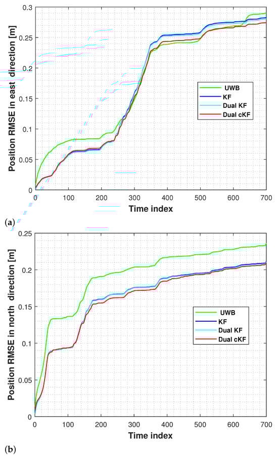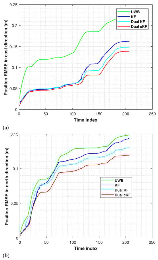 Figure 9a shows that all the filters are effective in reducing the localization error when compared with the UWB’s solution in the east direction. When compared with the KF, the dual KF can further improve the localization error, which shows the dual model’s effectiveness. To the north direction, from Figure 9b, we can see that the KF’s position RMSE in the north direction is smaller than that of the UWB at the last time index. The dual KF provides the north position with a smaller RMSE than the KF method does at the last time index. The proposed dual cKF method’s north position RMSE is the smallest at the last time index, highlighting the effectiveness of the proposed approach.
