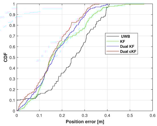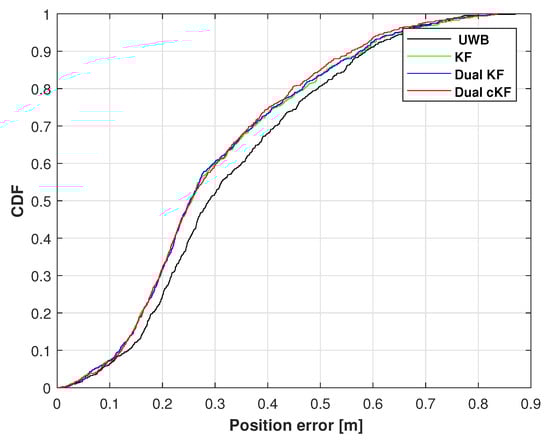 Position error cumulative distribution function (CDF) measured by UWB, the KF, the dual KF, and the dual cKF in Test 1.