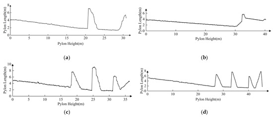(3) A novel method for calculating pylon parameters based on point cloud distribution characteristics is proposed. This method can effectively extract point cloud specific information and ensure the accuracy of the parameter calculation. Through the calculation and analysis of 80 groups of pylons, it could be found that the maximum relative error produced by this algorithm did not exceed 5%, thus verifying the feasibility of the algorithm.