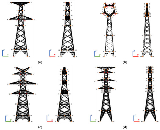 Pylon feature points and numbers, and red points are the feature points obtained by combining with the surrounding orange points. (a) Type-a pylon. (b) Type-b pylon. (c) Type-c pylon. (d) Type-d pylon.