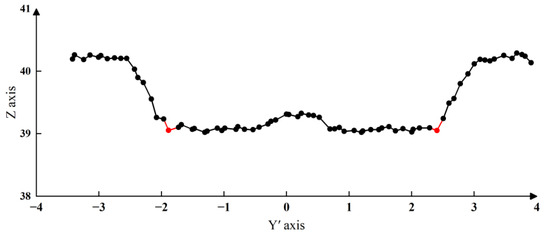 The redirected pylon point clouds are projected onto the Y′Z plane, and then vertically layered along the Z-axis at a certain interval of h1. The boundary points of each layer are found by using a sliding window. These points form the overall pylon shape curve. Considering the symmetry of the pylon structure, half of the boundary points can be selected and connected in sequence. Finally, uniformly spaced discrete curves, which are the pylon point cloud shape curves, are obtained, as shown in Figure 3.