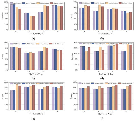 Identification results of pylon types using different similarity measurements. (a) The precision of four similarity measurements (original dataset). (b) The recall of four similarity measurements (original dataset). (c) The F-score of four similarity measurements (original dataset). (d) The precision of four similarity measurements (linearly transformed dataset). (e) The recall of four similarity measurements (linearly transformed dataset). (f) The F-score of four similarity measurements (linearly transformed dataset).