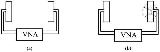 Antenna setup for on-drone gain measurements in an OATS: (a) horizontal, off-drone face-to-face antennas as a reference; (b) horizontal, on-drone face-to-face antennas.
