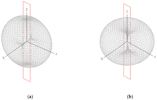 It should be emphasized that a one meter-long, folded dipole acts mostly like an electrically small loop near the lowest limit of the HF range, and as an electrically short dipole, near the highest limit. In between, both modes of radiation, i.e., the loop mode and the dipole mode, are present and comparable. The loop mode (Figure 4a) provides omnidirectional radiation in the antenna plane, i.e., YOZ, and a dual polarization, except for the XOY plane, where solely the OZ polarization is present. The dipole mode provides omnidirectional radiation in the XOY plane (Figure 4b), and a linear polarization along the OZ axis.