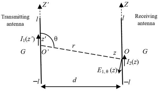As the antenna length and the distance between antennas fall in the same order and both are much shorter than the wavelength, measurements are performed in the near-field zone. The most important effect compared to a far-field measurement setup comes from the variability of the longitudinal component of the electric field generated by the transmitting antenna along the receiving antenna (Figure 6).