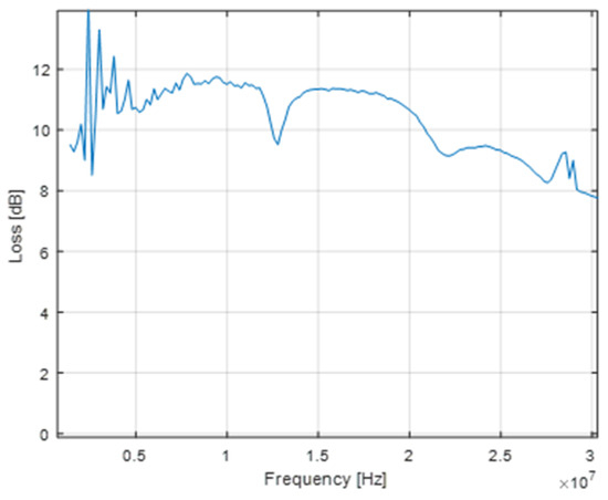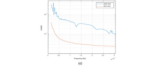 Figure 8 shows the variation as a function of frequency of the resistance, reactance, and VSWR at the antenna input. Losses in the antenna wire and balun make it possible to obtain a VSWR mostly below five over the frequency range of interest, i.e., between 7 and 30 MHz. The efficiency ranges between −36 and −7.8 dB; however, our gain measurements yield stable results for transmission between two such antennas placed at distances of up to 2.5 m one from the other, and for an input power of 0 dBm.