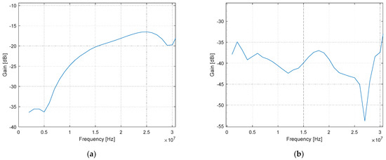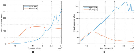 Such a dipole is electrically short over the entire HF band; as a result, the impact of the common mode currents on gain measurements is quite high [32]. One-to-one baluns were used as part of the antenna in order to reduce the effect of the common mode currents, and thus the antennas will be characterized including the transformers. The same balun will be used with the probe on the drone as well. When used as a probe on a drone, the folded dipole has no feeder, and therefore the common mode current would not impact on the radiation pattern as it does when measuring the probe gain. Conversely, the current would close through the ground of the on-drone data-acquisition circuitry and may therefore induce erratic operation. In Section 4, we will thoroughly analyze the effect of the balun in terms of input impedance and losses.