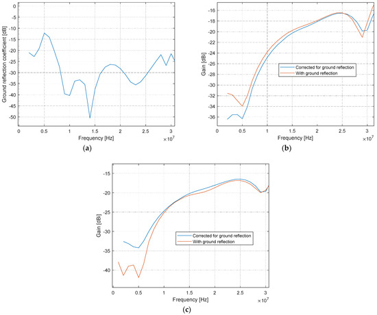 Ground effect: (a) ground reflection coefficient; (b) gain: horizontal ‘face-to-face’ orientation, with and without ground reflection correction; (c) gain: horizontal ‘coplanar’ orientation, with and without ground reflection correction.