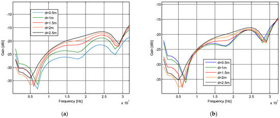 Two identical, electrically small dipoles were placed in a horizontal face-to-face position 0.5, 1, 1.5, 2, and 2.5 m away one from the other. One of the antennas was placed at first off-drone (Figure 12a) and then on-drone (Figure 12b).