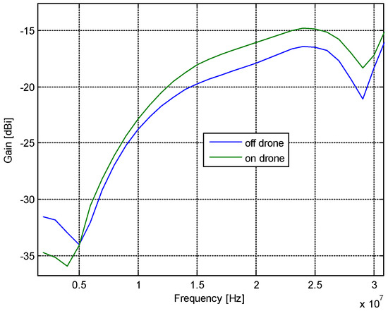 Figure 14 depicts a gain comparison for the on-drone and off-drone configurations. An accuracy improvement in the probe gain assessment of up to 2 dB can be noted by correcting the results for the drone-proximity effect.