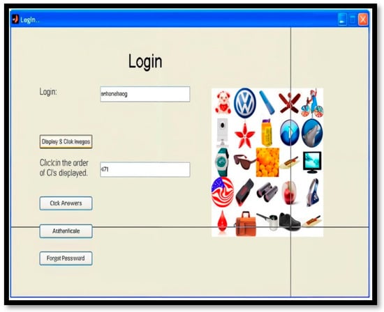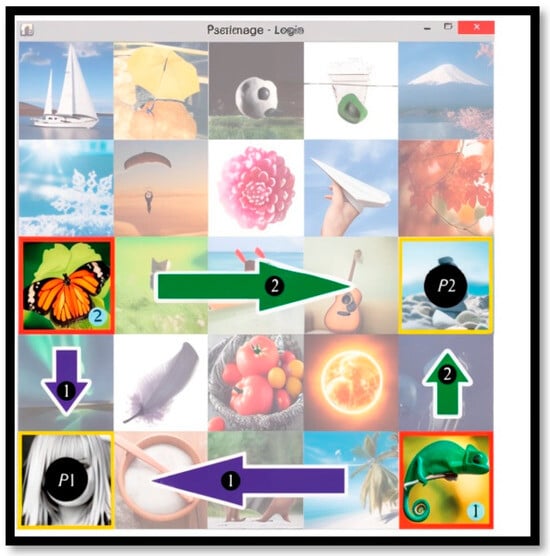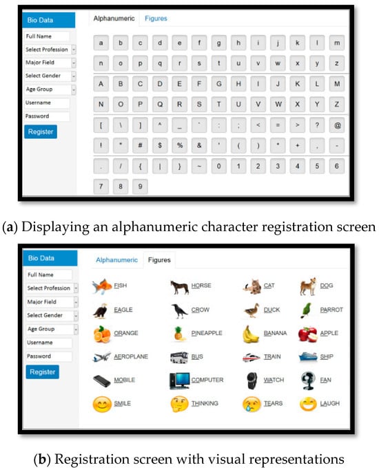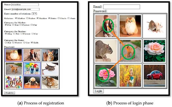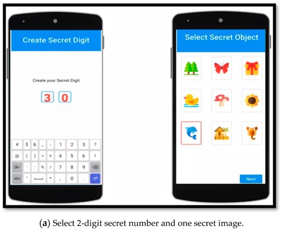 Pandey and Praveen Kumar, in 2019 [], presented in Figure 5 a graphical password authentication system in which users choose certain images that they must then recognize in order to log in. Recall-oriented techniques and recognition are integrated into this system. Additionally, a recall-centric graphical technique is used, where users must replicate images or sequences selected in the (a) registration process to authenticate themselves. Robust security measures have the capacity to utilize the system’s user-centric interface and efficiency to enable (b) user login phase in a secure and convenient manner, especially for users with limited technical knowledge. Additionally, the password generation procedure integrates recognizable visual prompts from daily life to improve user-friendliness and memory recall, thus making the system advantageous for a wide array of users.